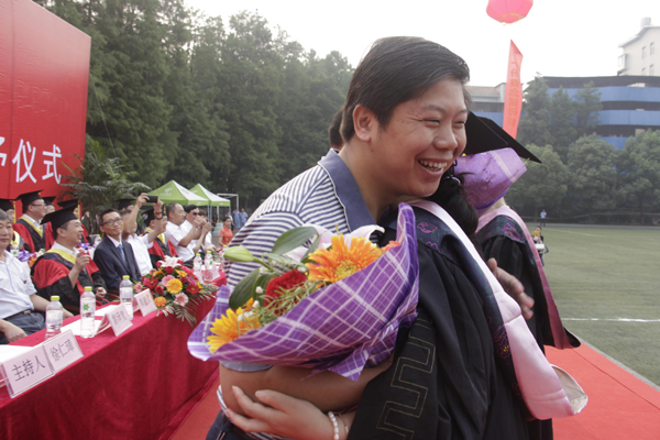 除了常规的表彰、学位授予等项目,毕业典礼还设置了毕业生向家长和老师献花环节,毕业生们把美丽的鲜花献给来自全国各地的家长代表和各系教师代表,表达对父母的养育之恩,对老师的教育之情。