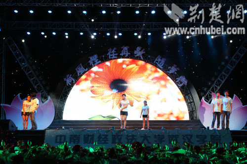 晚会进行期间,舞台两边的投影仪上不断更新着学生们来自新浪微博的信息,来自中南财经政法大学、华中师范大学、华中农业大学等院校的学生纷纷送来祝福。