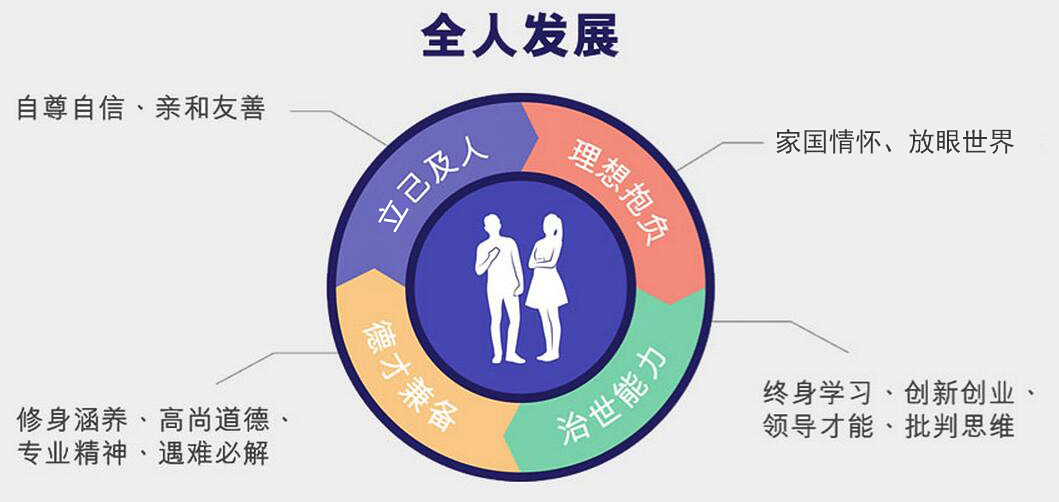 全人发展(Whole Person Development)以学生为主体,并将学生视为完全的个体,以充分激发学生潜能及培养完整个体为目标。全人发展教育理念及实践模式聚焦学校学子未来的增值能力和卓越精神,不仅关注学生在智力和知识方面的进步,更强调学生在人文修养方面的提升,在心理健康方面的发展,在道德、价值和信念方面的追求,以及作为一个现代社会公民责任感的培养。课堂上,学生将接受专业教育和广博的通识教育,课堂外通过体验式拓展和实践活动发展领导力、人际关系和团队合作等能力。通过课内外学习、生活,全方位培养学生四类、十二个方面的全人素质。